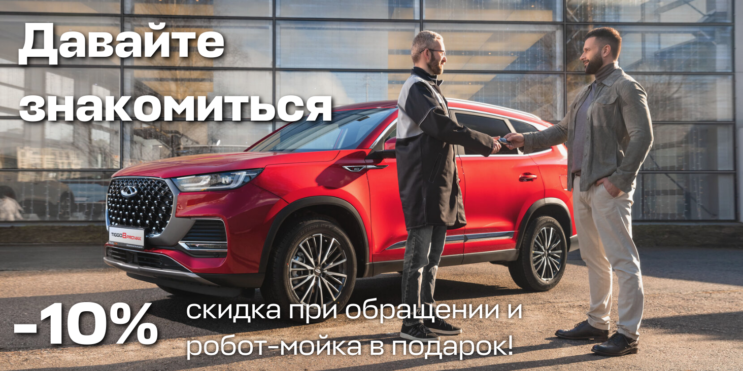 Мы рады приветствовать первых владельцев автомобилей Chery в нашем автосалоне! В честь вашего первого визита мы приготовили специальное предложение: получите 10% при обращении и бесплатную роботизированную мойку вашего автомобиля. Это отличная возможность испытать наш сервис и заботу о вашем автомобиле. Ждем вас в нашем автосалоне, чтобы сделать ваше первое посещение незабываемым!